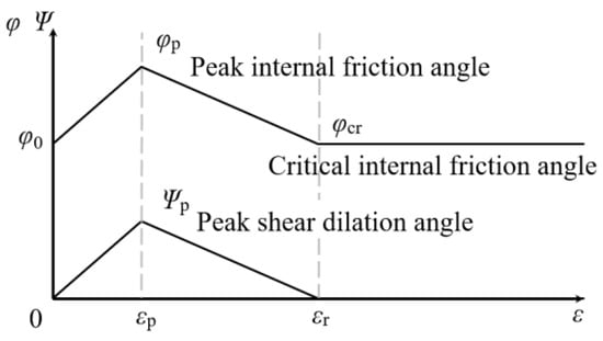 The foundation soil is classified as Nantong silty sand, with the relevant geotechnical investigation data summarized in Table 3. The silty sand exhibits a compactness ranging from slightly dense to medium dense. Due to local interlocking between soil particles, the material exhibits slight shear dilation, resulting in a minor increase in both the internal friction angle and dilation angle until the peak value is reached. As strain continues to increase, the soil experiences strain softening, and both the internal friction angle and dilation angle gradually decrease to the critical value. In reality, the internal friction angle and dilation angle change nonlinearly with strain, but for simplicity, their variation is described in three linear stages [,,]. The soil behavior is modeled using the Modified Mohr–Coulomb (MMC) plasticity model [], as illustrated in Figure 5.