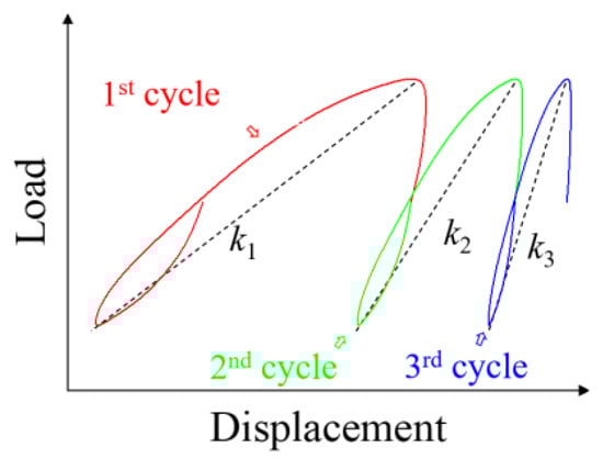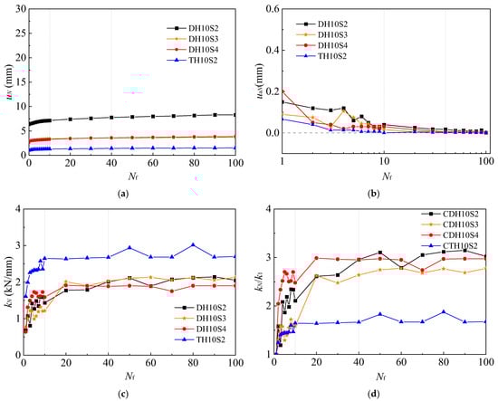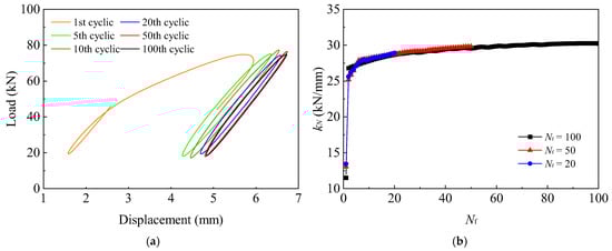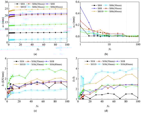 Figure 12 presents a comparison of the cyclic response at different numbers of loading cycles. In Figure 12a, during the initial stage of cyclic loading (the first 20 cycles), the cumulative displacement increases rapidly, with u20 exceeding 95% of u100, marking the rapid response phase. From the 20th to the 50th cycle, the accumulation slows significantly, resulting in only minor increases in displacement—this phase is referred to as the slow accumulation stage. Between the 50th and 100th cycles, uN shows almost no further increase, and the displacement curves for the 50th and 100th cycles nearly overlap, indicating an elastic deformation state. In Figure 12b, kN increases rapidly and nonlinearly during the first 20 cycles and then tends to stabilize over the subsequent 80 cycles. Specifically, k1 is approximately 12 kN/mm, while k20, k50, and k100 are 28.9 kN/mm, 29.8 kN/mm, and 30.2 kN/mm, respectively. Correspondingly, the values of βk are 2.41, 2.48, and 2.52.