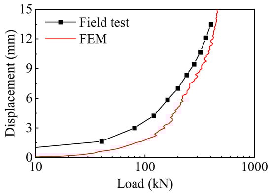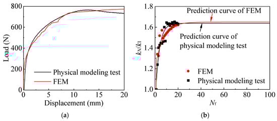 Comparison between FEM and physical modeling test: (a) load–displacement curve and (b) kN/k1–Nf curve.