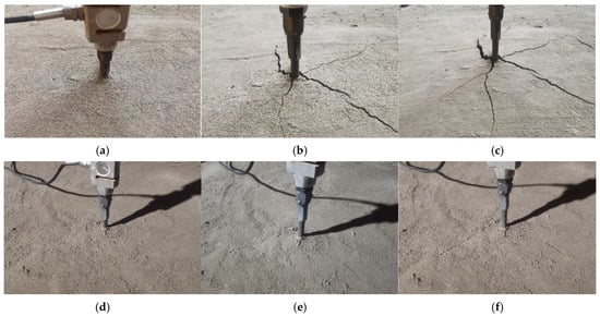 Surface failure process of silty sand: (a–c) SH4 and (d–f) SH10.
