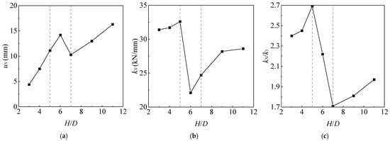 Displacement and stiffness for different H/D: (a) uN-H/D curve; (b) kN–H/D curve; and (c) kN/k1–H/D curve.