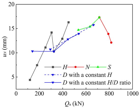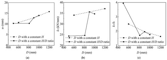 In the study of factors affecting the plate diameter, two scenarios are considered: one with a constant H/D ratio (D = 500 mm, 810 mm, 900 mm, 1000 mm) and another with a constant H (D = 600 mm, 900 mm, 1200 mm). Furthermore, both uN and kN are positively correlated with D, while kN/k1 is negatively correlated with D, regardless of whether H/D or H is held constant, as shown in Figure 14. This trend is more pronounced when H is kept constant.