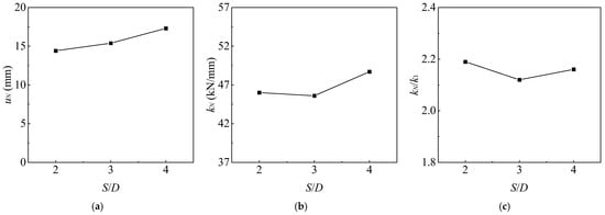 Displacement and stiffness for different S/D: (a) uN-S/D curve; (b) kN–S/D curve; and (c) kN/k1–S/D curve.