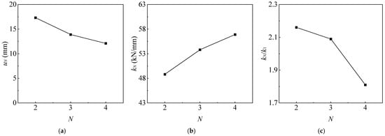 Displacement and stiffness for different N: (a) uN-N curve; (b) kN–N curve; and (c) kN/k1–N curve.