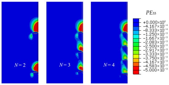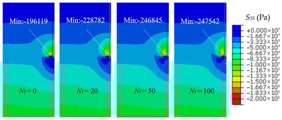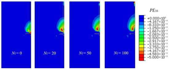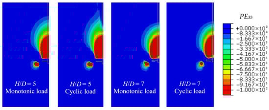 Figure 17 and Figure 18 show the soil stress and plastic strain contour maps corresponding to Nf = 0, 20, 50, and 100 under the same load at the end of cyclic loading. The soil stress and strain refer to the vertical compressive stress S33 and vertical compressive plastic strain PE33. In the stress contour maps, the minimum value represents the maximum compressive stress. During the pullout process of the plate from the foundation, the overlying soil is compressed, forming a concentrated stress zone within a certain height above the plate. The maximum compressive stress increases with the number of load cycles, although the rate of increase gradually decreases. The maximum stress values for Nf = 50 and 100 are approximately the same. Moreover, compared to monotonic loading, the plastic strain zones for Nf = 20, 50, and 100 are similar and significantly larger than that of Nf = 0. This indicates that the “pile–soil” system exhibits a relatively rapid cyclic response during the early stages of cyclic loading, which warrants investigation.