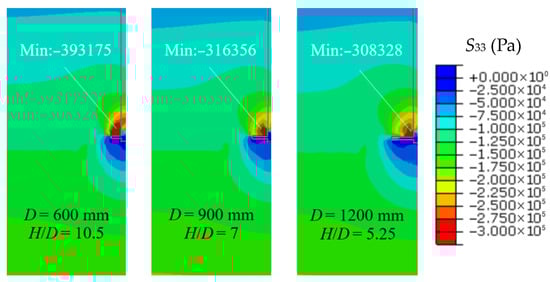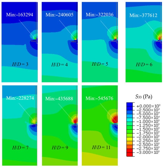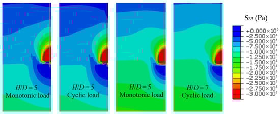 Contour maps of stress under the 20th cyclic Qmax loading condition for different H/D.