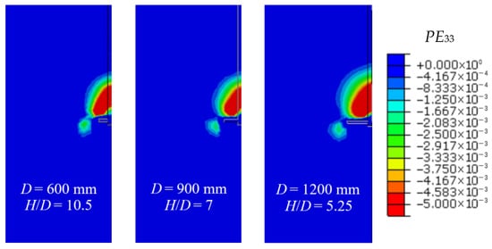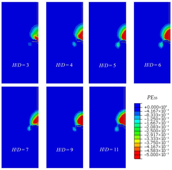 Contour maps of strain under the 20th cyclic Qmax loading condition for different H/D.