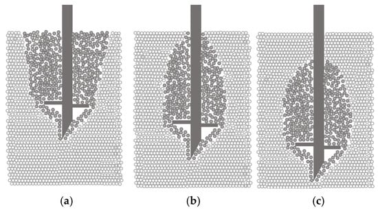 Additionally, as shown in Figure 25, cumulative displacement generally increases with the rising ultimate bearing capacity. However, a decreasing trend is observed at the critical embedment depth ratio and with an increasing number of plates. As shown in Figure 13, when the embedment depth ratio (H/D) transitions from five to six, the cumulative displacement increases while the axial stiffness decreases. In contrast, when H/D transitions from six to seven, the cumulative displacement decreases and the axial stiffness increases. According to previous studies [,,], when the helical pile is shallowly embedded (H/D ≤ 5), the slip surface reaches the ground surface, as illustrated in Figure 26a. When deeply embedded (H/D ≥ 7), the slip surface is confined within the soil, as shown in Figure 26c. During the transitional phase, the failure surface is depicted in Figure 26b. As the helical pile transitions from shallow to transitional embedment, its bearing mechanism changes. The “pile–soil” bearing system contracts, the axial stiffness decreases, and the load increases, resulting in increased cumulative displacement. Conversely, as the pile transitions from transitional to deep embedment, the soil stress level increases and the axial stiffness rises. In this case, the increase in the axial stiffness outweighs the increase in the load, leading to a reduction in cumulative displacement. Furthermore, as the number of plates increases, the extent of the “pile–soil” bearing system expands and the axial stiffness improves. Similarly, the increase in the axial stiffness surpasses that of the load, resulting in reduced cumulative displacement.
