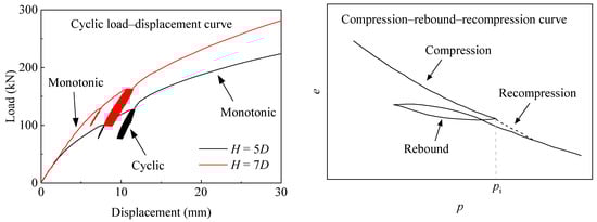 From the perspective of the hysteresis curve, as shown in Figure 27, the response of the helical pile foundation under cyclic loading resembles the compression–rebound–recompression curve observed during unloading and reloading after an initial pressure pi is applied in a one-dimensional soil consolidation test. In the cyclic jacking of a helical pile, the soil above the plate is compressed, while in laboratory tests, the soil below is subjected to loading. The resulting stress–strain responses can be interpreted as hysteresis loops for a single cycle. In the laboratory, soil deformation consists of both recoverable elastic deformation and irrecoverable residual deformation. When the applied pressure exceeds pi, the recompression curve continues seamlessly from the compression curve, as though no unloading–reloading occurred. This aligns with the observed phenomenon that cyclic loading has a negligible impact on the subsequent pullout capacity of helical piles.
