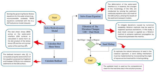 Figure 1 illustrates the coupling procedure in a flowchart for the classical approach, which needs to be repeated at every time step of the simulation. Shear stress information, resulting from hydrodynamic modelling, is used to compute sediment transport on the GIB surface, and mesh adjustments are made accordingly. During the solution process, numerical instability may arise, as noted by Stahlmann and Schlurmann [39]. To mitigate deviations caused by such instability, filtration methods are applied to suppress spurious oscillations. In this study, a dual-mesh concept and mesh-to-mesh interpolation are employed as a filtering technique to enhance the numerical stability of sediment propagation. This is followed by a sand sliding mechanism to replicate the natural behaviour of sand. Finally, the updated mesh is used as the computational mesh for the next time step in the solution process.