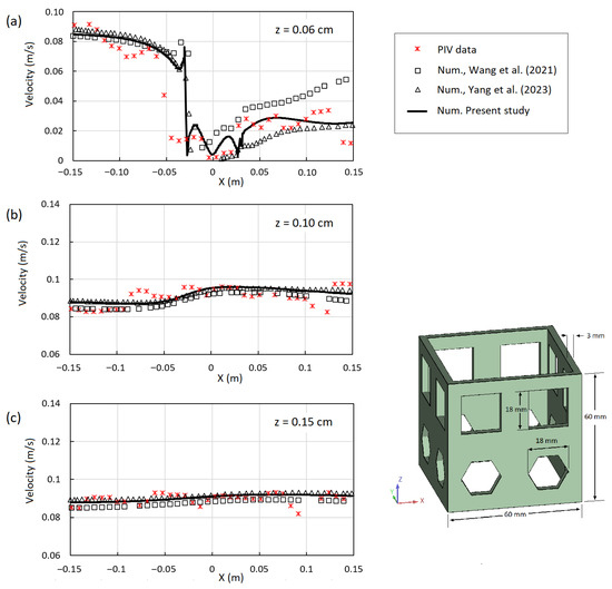 The results of the flow field modelling adjacent to an AR at (a) = 0.06 cm, (b) = 0.10 cm, (c) = 0.15 cm on the symmetry plane compared with experimental and numerical results extracted from Wang et al. [16] and Yang et al. [45].