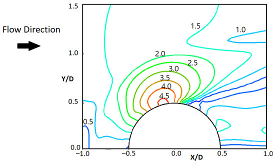 Figure 3 shows the Normalized Mean Bed Shear Stress (NMBSS) contours obtained from numerical modelling using the RANS equations in combination with the k-ω SST turbulence model. The NMBSS is calculated by normalizing the time-averaged bed shear stress (BSS) by the BSS of the undisturbed flow field. The results are compared with experimental data reported by Sadeque et al. [46]. In the experimental data, the maximum NMBSS occurs at 100° from the stagnation point, near the cylinder surface, with a peak value of 5.5. In comparison, the numerical simulations predict the maximum NMBSS at 80° from the stagnation point, with a corresponding value of 4.7. Despite these differences, there is strong agreement between the experimental and numerical results in predicting the overall shear stress patterns both upstream and downstream of the cylinder.