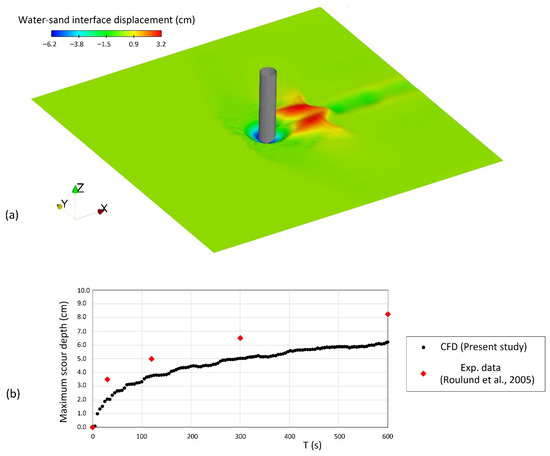 (a) Simulated local scour at t = 10 min, (b) Progression of maximum local scour depth over time during the first 10 min of the simulation, compared with experimental results extracted from Roulund et al. [41].