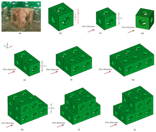 (a) An RC deployed in the waters of Torbay; (b) Schematic of the geometric characteristics of the RC designed by ARC Marine; (c,d) RCs with 90° and 45° orientation angles to the flow, each with a side length of D = 1.5 m; (e–g) Arrangement of groups of two, four, and six RCs, each with a side length of D = 0.75 m; (h–j) A group of ten RCs with different arrangements of the top four cubes in the front, middle, and back, each with a side length of D = 0.75 m.