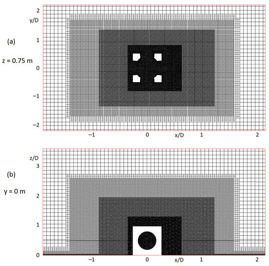 RCs with a side length of D = 1.5 m were analyzed with two different orientation angles, 90° and 45°, as shown in Figure 6c,d. Table 6 presents the results of the calculated upwelling region volume for the RC with a 90° orientation to the flow as part of the mesh independence study. The outcomes indicate a high degree of mesh independence, particularly in cases with medium and fine mesh resolutions (showing changes of approximately 1% in the volume of the upwelling region). Figure 7 shows horizontal and vertical slices of the generated mesh in the region of interest around the RC with a 90° orientation to the flow. Therefore, the fine mesh results were selected for post-processing. The same mesh generation setup, as described above, was applied to all other simulations.