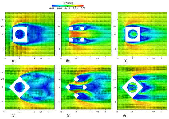 Flow field contours at different horizontal plane Z = 0.375 m, Z = 0.75 m, and Z = 1.125 m for a single RC with (a–c) 90° and (d–f) 45° orientation angle to the flow, respectively.