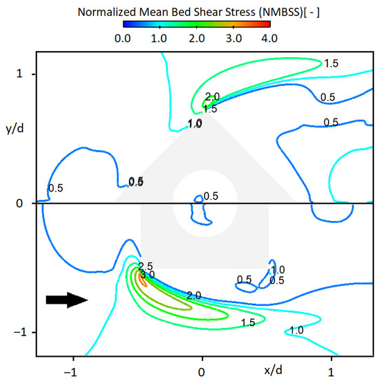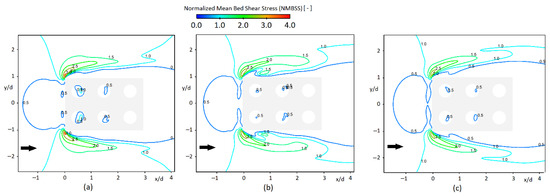 The NMBSS contours for RCs with different configurations are shown in Figure 13. The maximum NMBSS value and the affected area slightly decrease as the number of back-to-back RCs increases. This indicates that increasing the number of back-to-back RCs may enhance the long-term stability of the structures by providing greater resistance to scouring.