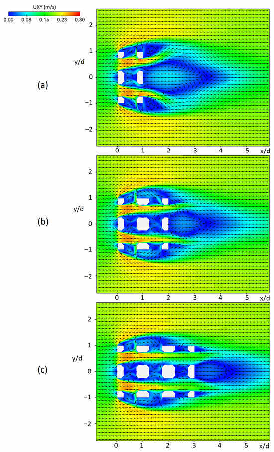 Flow field at a horizontal plane (Z = 0.375 m) for the arrangements of (a) two, (b) four, and (c) six RCs.
