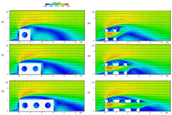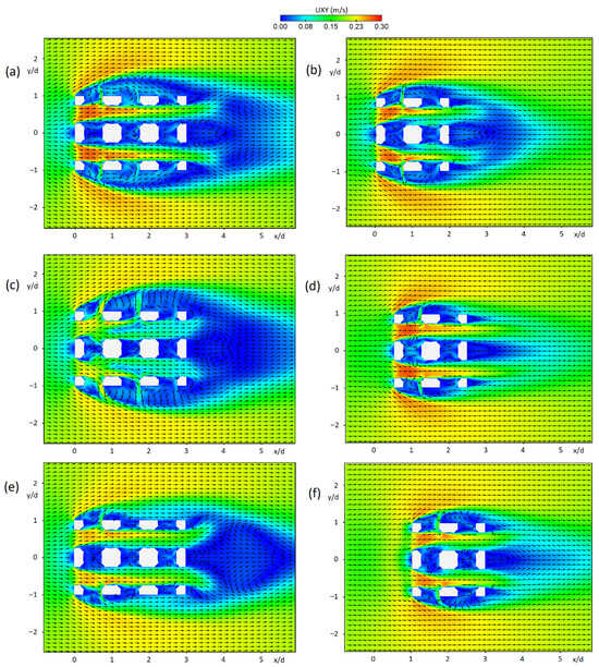 Flow field at vertical planes Y = 0 m and Y = 0.375 m for the arrangements of (a,b) two, (c,d) four, and (e,f) six RCs, respectively.