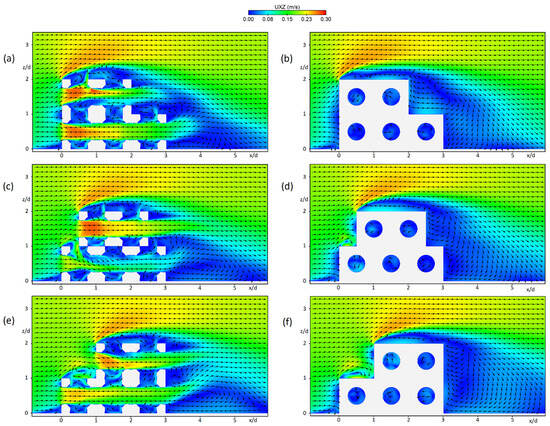 Flow field contours for a group of ten RCs with different arrangements of the top four cubes; (a,c,e) for front, middle, and back arrangements at Y = 0 m, respectively; and (b,d,f) for front, middle, and back arrangements at Y = 0.375 m, respectively.