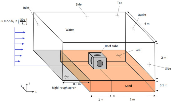 To mimic Torbay water environment for the simulations, a three-dimensional computational domain with 18 long, 12 wide, and 7 height is generated, whereas the RC structure is placed 10 away from the inlet and at the symmetry plane. The applied boundary conditions for all hydrodynamic simulations are listed in Table 5. The bottom boundary is satisfied using OpenFOAM built-in boundary conditions; no-slip is used for the bottom boundary and the turbulence properties are treated using different wall functions for smooth and rough-surfaces, see Cebeci and Bradshaw [50] and Cebeci and Chang [51], with respect to the applied turbulence models. Nikuradse’s equivalent sand roughness, , for the sandy bed is suggested to be equal to [41,52]. Therefore, considering the seabed of Torbay as a mixture of non-cohesive sand and silt with was estimated in the simulation for sandy bed. The roughness of the RC surfaces is also defined, = 2 mm, provided by ARC Marine. The inlet flow is defined = 0.2 m/s, similar to the maximum mean tidal flow velocity measured in Torbay water.
