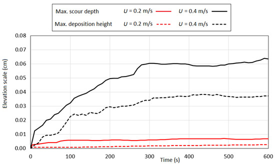 Figure 18 illustrates the temporal evolution of maximum scour depth and deposition height around the RC for different flow velocities. Data were collected at 10 s intervals. The simulations were conducted over the first 10 min of physical time, during which a rapid progression in scour hole development occurs. Figure 19 presents the simulated water-sand interface displacement contours for the two flow velocities at t = 10 min. The primary scouring impact is concentrated at the upstream corners of the RC, while sediment deposition predominantly occurs downstream and along the sides of the structure. This pattern aligns with the simulated BSS distribution contours, which predict the highest BSS magnitudes near the upstream corners. intensifies scouring, leading to a scour hole approximately ten times deeper. These results underscore the importance of accounting for extreme flow conditions in scour progression analyses, as short-duration events can have severe implications for the stability and failure risk of AR structures.
