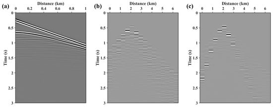 The shot gathers from (a) towed streamer pressure component, (b) OBN vx component, and (c) OBN vz component.