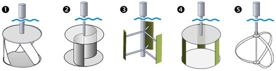 Common types of vertical axis water turbines: (1) Gorlov, (2) Savonius, (3) H-Darrieus, (4) Squirrel-cage Darrieus, and (5) Darrieus.