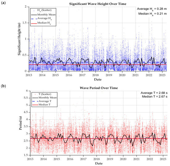 Wave characteristics at the Al Khobar site were retrieved from the Global Ocean Physics Reanalysis dataset [33], provided by Mercator Ocean International through the European Union’s Copernicus Marine Service. This dataset combines satellite observations and in situ measurements to provide high-resolution oceanographic information from 1993 to 2022. The time series data from 2013 to 2023, presented in Figure 2a,b, show significant wave height and mean wave period, respectively. Significant wave heights ranged from 0.01 m to 1.91 m, while mean periods ranged from 1.58 s to 5.94 s. The average/median values were 0.28/0.21 m for wave height and 2.68/2.67 s for wave period. These values confirm that the site experiences relatively calm and consistent wave conditions.
