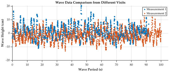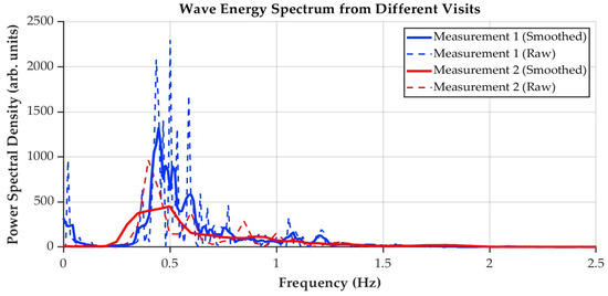 The recorded video was analyzed using Tracker 5 software [34], which generated a time series of wave elevation and its corresponding frequency spectrum. Observed wave heights ranged from –0.11 m to 0.20 m. The measured wave period was approximately 2.22 s, and the dominant frequency was found to be about 0.45 Hz. These values are consistent with the average and range obtained from the historical dataset, confirming the validity of the measurement approach. Figure 4 shows the wave height data measurement data from the two separate visits, while Figure 5 displays the associated frequency spectrum.