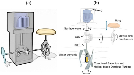 To address these shortcomings, researchers have explored hybrid systems with multiple and higher degrees of freedom systems such as solar–wave [2], wind–solar [3], and wind–tidal [4] systems. The current study focuses on integrating wave and current energy into a single low-cost, compact system [5] that combines a heaving buoy and a vertical axis current turbine, linked through a dual-rotor generator and a bi-directional mechanical motion rectifier mechanism capable of capturing energy from both modes without complex coupling systems.