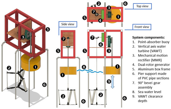 Figure 7 shows the different views of the final concept after a series of design changes and trade-offs, along with the key components in its final assembled form that were built and tested. The total cost to build the system, including materials, equipment and instrumentation, was approximately SAR 1500 (USD 400). The key features of the final design include (1) a hollow point-absorber buoy made of polyurethane foam with a lid to hold weights, (2) a helical-blade vertical axis wind turbine (VAWT), (3) a modified MMR with overdrive, and (4) a dual-rotor generator, along with the necessary linkages, bearings, and gear drives. The key innovative features of this design are as follows: