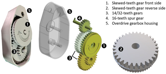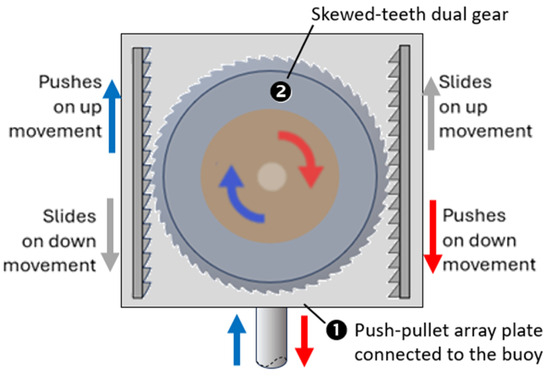To transform the oscillatory motion of the buoy into unidirectional rotational motion, a specifically designed MMR, as shown in Figure 8, was built. At the heart of the MMR is the skewed-teeth dual gear (Figure 9). The skewed-teeth side (item 1) engages with the push-pullet array plate, which is attached by a rod to the point-absorber buoy. The other side (back) with regular gears is connected to a 1:10 ratio overdrive gearbox. This arrangement ensures that the one oscillation of the buoy is converted into ten by the modified MMR and overdrive gearbox. This was necessary, as will be explained later, to allow higher rpm input to the dual-rotor generator for reasonable power generation.