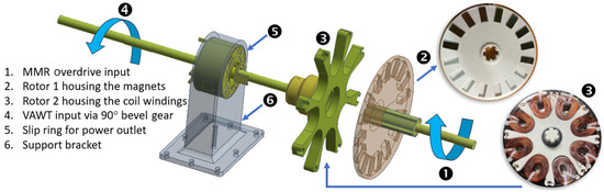 Figure 10 illustrates the dual-rotor generator subassembly along with its different components and rotations. Here, the dual-rotor generator consists of two rotor discs, one housing the permanent magnets and connected to the output shaft from the modified MMR overdrive gearbox and the other containing copper-coil windings driven by the VAWT’s shaft via a 90° bevel gear with a 1:3 ratio. The arrangement is such that the two inputs to the dual-rotor generator are counter-rotating; i.e., the coil windings and the magnets independently counter-rotate. The latter constraint is overcome by providing the boost to rpm by the 1:10 ratio overdrive gear on the magnet side and 1:3 ratio 90° bevel gear on the coil-windings side, resulting in increased electricity generation through enhanced electromagnetic induction at lower relative rpms. It is noted here that the 1:10 overdrive gear ratio was used to boost the buoy rpm (from 30 to 50) to a reasonable value (of around 300 to 500) for voltage and current measurements from the in-house designed and built generator, as well as for validation against an off-the-shelf generator. A full-wave rectifier circuit is used to convert the alternating current into direct current. Finally, a slip ring is used to transfer electrical current from the rotating coil windings to a stationary outlet for power measurements.