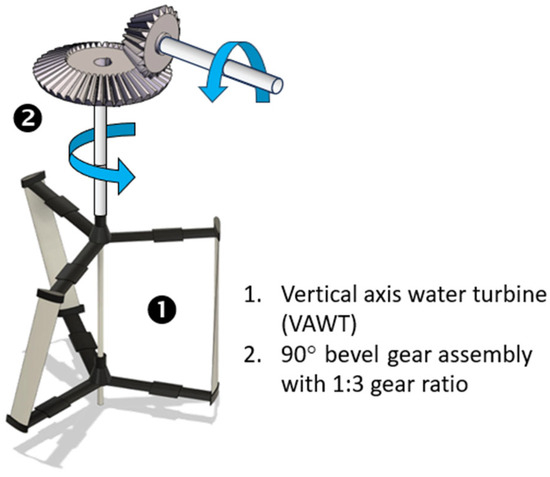 Figure 11 illustrates the vertical axis water turbine (VAWT) and 90° bevel gear subassembly. The specific design of the VAWT with skewed blades and Darrieus configuration was chosen for its omni-directional characteristics, as well as the smooth variation of the turbine torque during its complete 360° rotation, as compared to a straight-bladed Darrieus configuration.