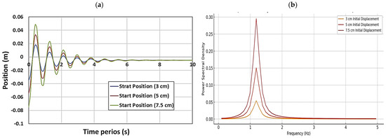For the chosen buoy geometry, different drafts were checked and tested to verify natural frequencies at different submergence depths. Natural periods of the buoy for different drafts were estimated through numerical heave decay simulations using ANSYS AQWA. Detailed hydrodynamic simulation results are presented in Section 7. Figure 13 shows: (a) the response of the buoy tested at a draft of 8.5 cm for three different release depths, and (b) the corresponding heave power spectral density.