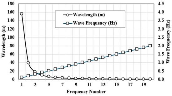A representative wave profile was defined, using a sinusoidal wave with an amplitude of 0.1 m. The sea water density was set to 1025 kg/m3, along with a water depth of 100 m and water area of 1.02 m × 0.91 m. Wave frequency was varied to study the response under different conditions from 0.1 to 2 Hz, corresponding to 10 s and 0.5 s periods, respectively. Figure 15 shows plots of wave frequencies and corresponding wavelengths as a function of frequency number based on the hydrodynamic diffraction analysis for a water depth of 100 m.