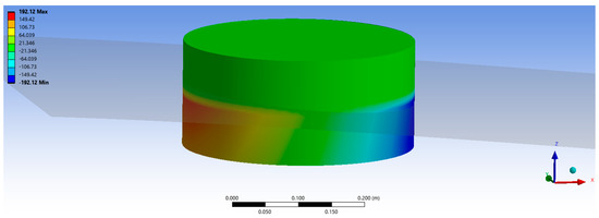 To ensure accurate simulation results, a structured mesh was generated with an element size of 0.02 m based on grid sensitivity analysis considering suitability for capturing the intricate fluid–structure interactions between the sea waves and the buoy, computational efficiency and result accuracy. The final mesh is made up of 1240 hexahedral elements adapted to the buoy’s geometry and the surrounding fluid domain. Figure 16 shows ANSYS AQWA simulation of the pressure distribution as head of water on the buoy surface and the mesh.