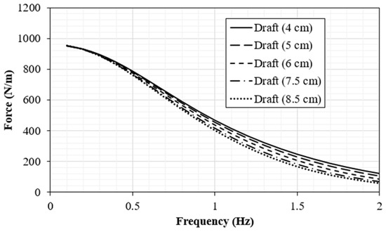 Figure 17 shows a comparison of the diffraction forces and Froude–Krylov forces experienced by the buoy for different drafts under identical wave conditions. The results indicate that these forces decrease as the wave frequency increases, which is typical since low-frequency (longer) waves apply more force. For the cases considered, the 4 cm draft experiences the highest force, indicating stronger interaction with longer waves.