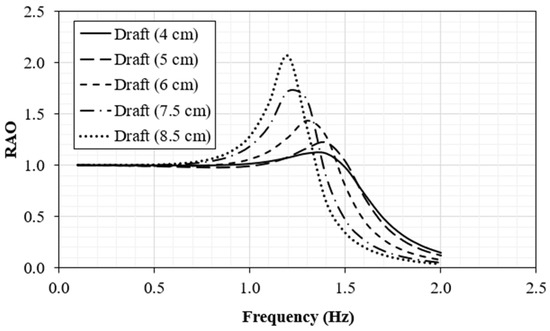 A comparison of the heave Response Amplitude Operators (RAOs) of the buoy for different drafts under identical wave conditions is shown in Figure 18. By comparing their RAO curves, we can observe how buoy geometry and draft affect its motion behavior as a result of wave excitation at different frequencies. This helps identify which design is more responsive or stable across various sea states, supporting better performance in wave energy applications. The buoy, evaluated across drafts from 4 cm to 8.5 cm, exhibits clear resonance behavior near 1.2 Hz, with the 7.5 cm draft producing the highest RAO value, indicating its natural frequency aligns closely with the incoming wave energy at that point. As the draft increases, the peak shifts slightly and the RAO magnitude decreases, showing the damping effect of greater submergence. The curve flattens more quickly for shallower drafts beyond the peak, reflecting reduced sensitivity to higher frequencies.