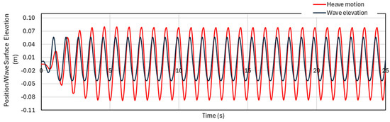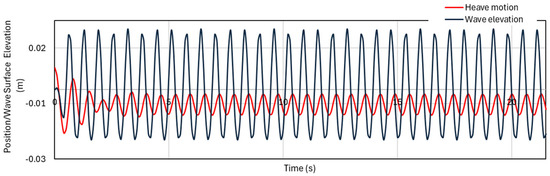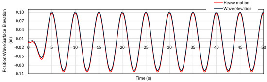 In order to assess the buoy’s dynamic reaction under wave excitation, its heave motion with the wave elevation is compared next. The time-series plot of the buoy heave motion under incident waves with periods of 5 s, 0.9 s, and 0.64 s is shown in Figure 19, Figure 20 and Figure 21. These wave periods were carefully selected to observe the buoy behavior in three different motion types: dominated by inertia, by stiffness, and at resonance. As expected, and as confirmed by the RAO analysis, the buoy shows a much larger response during the resonant period (0.9 s) compared to the wave height. At lower frequencies, the buoy follows the shape of the waves closely, while at higher frequencies, its movement becomes exceedingly small.