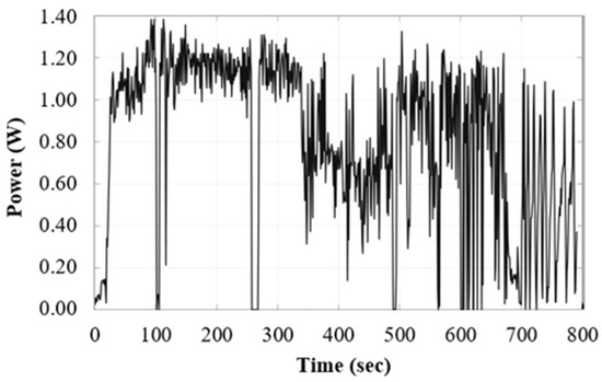 In this section, measurements from the in situ test are presented. Table 4 lists the buoy mass, the buoy submergence, and the wave frequency recorded during the test. The RMS value of velocity was determined from the ANSYS AQWA simulation. Figure 22 shows the plot of the measured power from the in situ test, where, on average, the system is generating approximately 0.72 W of power at the buoy rpm of 30, corresponding to the 0.5 Hz wave frequency.