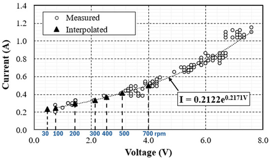 To validate the system’s power output, the voltage and current measurements were compared with the performance data of an off-the-shelf generator available in the market. The generator chosen in this case was the Dunkermotoren model GR 63x25 24V, rated at 48.4 W at 3300 rpm. This generator’s performance was measured using the same Arduino-based data acquisition setup. In this case, a power drill was used to rotate the generator shaft. A marker was taped to the hand drill for taking rpm measurements using a video camera. The Tracker software was used to correlate the current and voltage measurements to the recorded rpm values. Figure 23 presents the measured and interpolated voltage and current output of the Dunkermotoren generator model GR 63x25 at different rpms.