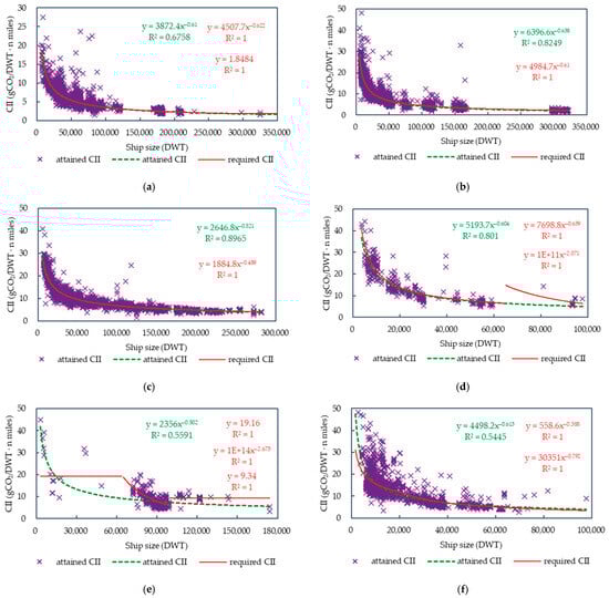 Technical energy efficiency metrics aim at measuring the energy consumption/emissions of a ship, depending on its design, whereas operational efficiency metrics also account for how a ship is operated. MARPOL Annex VI uses the annual operational CII to quantify the CO2 emissions per transport work. Regarding transport work, which is defined as the product of a ship’s capacity and the distance travelled in a given calendar year, there are different forms of expression, depending on the availability of data [51]. When the amount of cargo carried and the number of passengers could be obtained, which will substitute for the ship’s capacity, then the CII could be expressed as EEOI. When the amount of cargo carried and number of passengers are unavailable, deadweight tonnage should be used as the ship’s capacity for bulk carriers, tankers, container ships, gas carriers, LNG carriers, general cargo ships, refrigerated cargo carriers, and combination carriers; then the CII is expressed as AER; and gross tonnage should be used as the ship’s capacity for cruise passenger ships, vehicle carriers, ro–ro cargo ships, and ro–ro passenger ships, then the CII is expressed as cgDIST. The MRV publication of information includes annual average CO2 emissions per distance, combining with the ship’s DWT or GT, then the CII values expressed as AER or cgDIST can be obtained. Based on the above analysis, the operational energy efficiency expressed in CII by ship type was displayed by means of a graphical analysis and regression analysis, as shown in Figure 9. Average annual carbon intensity as per ship type was listed in the IMO DCS annual report for the reporting of 2023 [50]. As a reference, they are presented here. AERs for bulk carrier, tanker, combination carrier, containership, gas carrier, LNG carrier, general cargo ship, others, refrigerated cargo carrier, and passenger ship are 3.45, 3.88, 4.39, 7.31, 8.11, 8.50, 9.34, 25.58, 20.01, and 97.26 gCO2/DWT · n miles; cgDISTs for cruise passenger ship, ro–ro passenger ship, ro–ro cargo ship, and vehicle carrier are 10.66, 17.31, 10.91, and 5.69 gCO2/GT · n miles. However, the correlations between AER and DWT or between cgDIST and GT derived from this article have more potential for further academic research or policy making.
