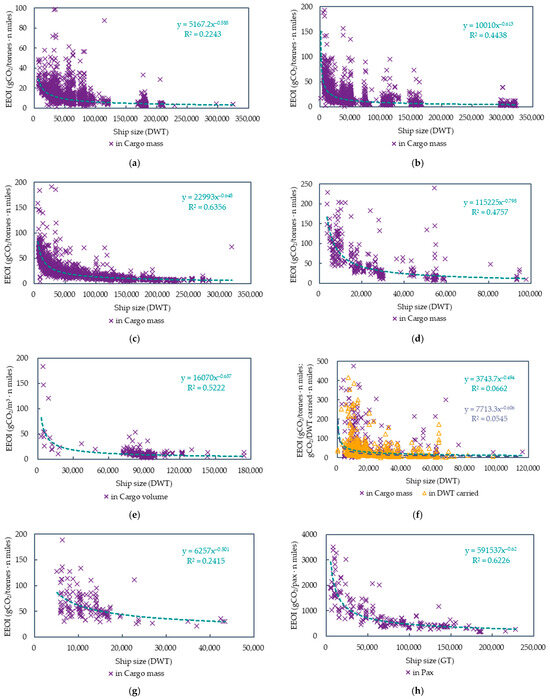 The 2023 MRV publication of information includes annual average CO2 emissions per transport work (mass), annual average CO2 emissions per transport work (volume), annual average CO2 emissions per transport work (DWT carried), annual average CO2 emissions per transport work (pax) and annual average CO2 emissions per transport work (freight), which are applicable for different ship types as listed in Table 4. Furthermore, the operational energy efficiency expressed in EEOI by ship type was displayed by means of a graphical analysis and regression analysis as well, as shown in Figure 10. Similarly, some operational energy efficiency data are manually excluded based on different standards for different ship types, but this does not mean that these excluded data are incorrect, nor does it mean that all retained data are correct, just for better graphical display. The operational energy efficiency data of different ship types have been fitted using power functions, but due to the relatively discrete distribution of these data, the resulting fitting formulas probably have no substantive significance and are mainly used for display.