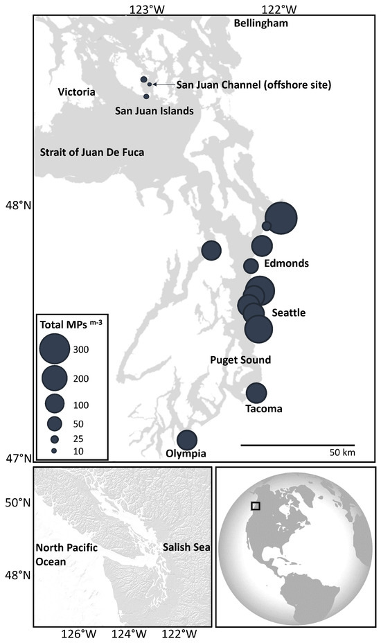 Map of central and southern Salish Sea, including sample locations in San Juan Islands and Puget Sound. Urban locations are identified. Dots indicate sample locations for microplastics scaled to relative concentration of microplastics. Maps below display the Salish Sea in context of the North Pacific coastline and its more general location in relation to the northern hemisphere.