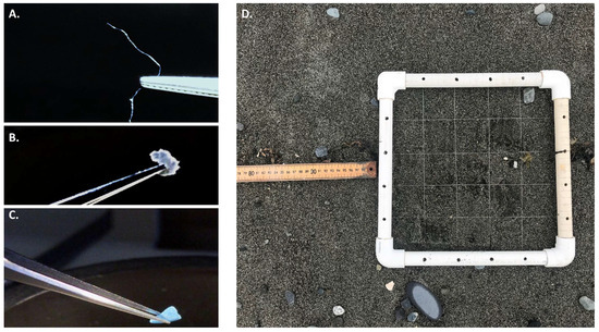Microplastics identified in sediments, including fibers (A), films (B), and fragments (C); (D) standardized quadrant sample tool.