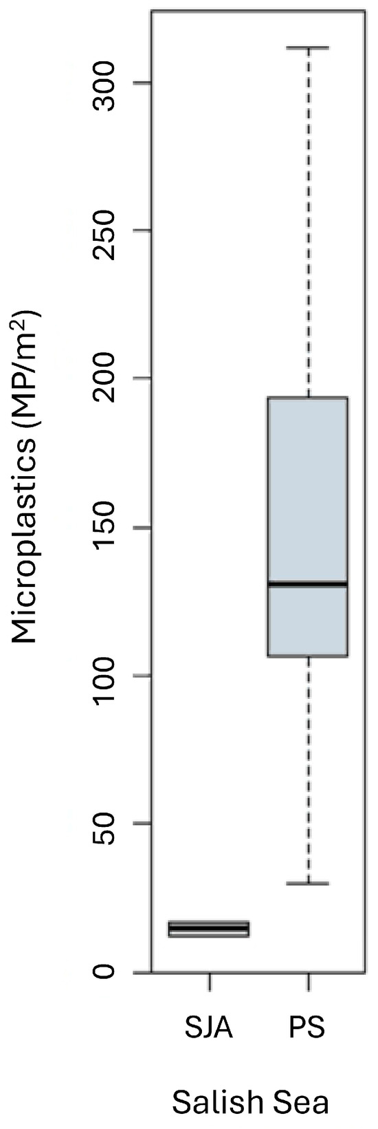 Boxplots of MP concentrations (microplastics/m2) in sediments, depicting regional differences within the Salish Sea between the San Juan Archipelago (SJA) and Puget Sound (PS).