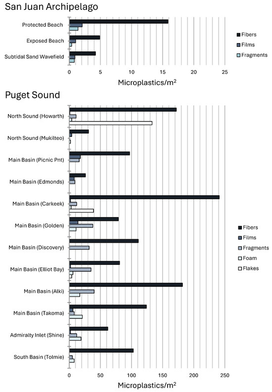 Plastics were classified according to their type—fragments, fibers, films, foam, and flakes. At the sites in both regions, fibers were the most abundant MP found. Additionally, fibers were found in almost every sample analyzed. In SJA sites, 87% of MPs were fibers, 8% were films, and 5% were fragments. Relative rates of the three types of MPs were similar between the sites (χ2 df = 4 = 1.40, p = 0.844; Figure 4). At the protected beach, 87.2% of MPs were fibers, 7.3% of plastics were films, and 5.5% were fragments. At the exposed beach, 86.5% of MPs were fibers, 10.8% were films, and 2.7% were fragments. The wavefield had 77.8% fibers and an equal proportion of films and fragments (11.1%). In Puget Sound sites, MP deposits were also predominantly fibers, comprising approximately 73% of the MPs collected (Figure 4). Films were 2% of the total. Flakes were the predominant type at Howarth Park in Everett (proximate to a naval shipyard) and were also present at two other locations—Carkeek Park in Ballard (commercial shipyard) and Elliot Bay (marina and port for cruise ships); the flakes were identified as an epoxy-based paint used for sealing ship hulls.