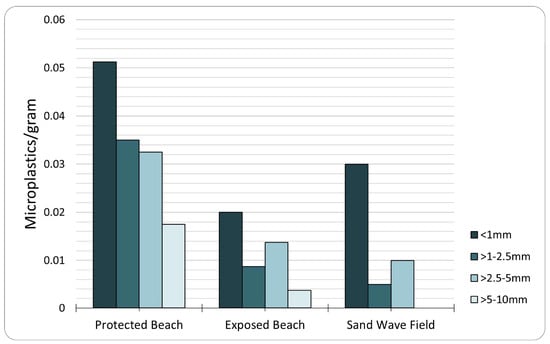 In our analyses, MPs were found in every sample analyzed and at each location. Even samples taken of sediments 80 m below the surface in a high-flow environment [17] contained MPs. This benthic feature is a large bedform of unconsolidated sediments—coarse-grain sand and shell hash fragments [15]. In our comparison of beach sites, the exposed beach site had the lowest overall concentration of MPs. This area is exposed to high tidal exchanges, strong wave energy, and alongshore hydrodynamics [73], all of which may prevent deposition and remove MPs that might otherwise accumulate over time.